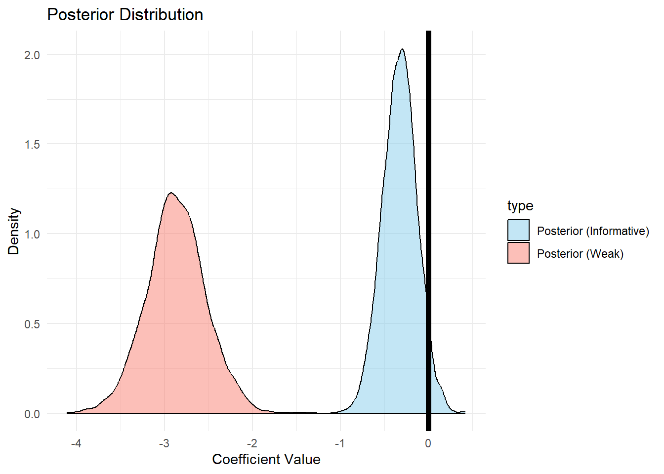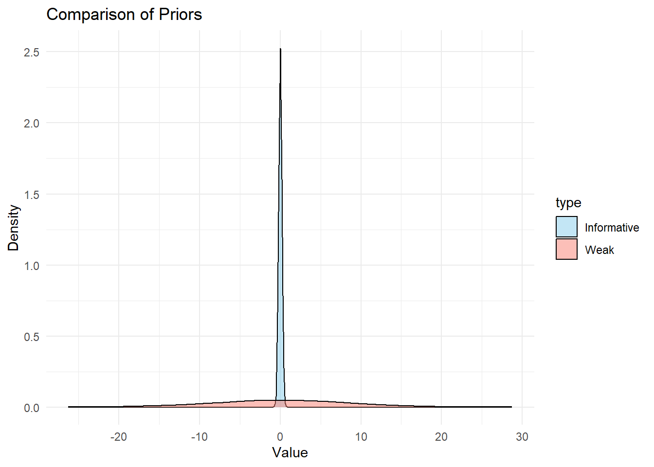 より狭い事前分布をおくと、事前分布が推定に与える影響が、広い事前分布の場合より大きくなる。
