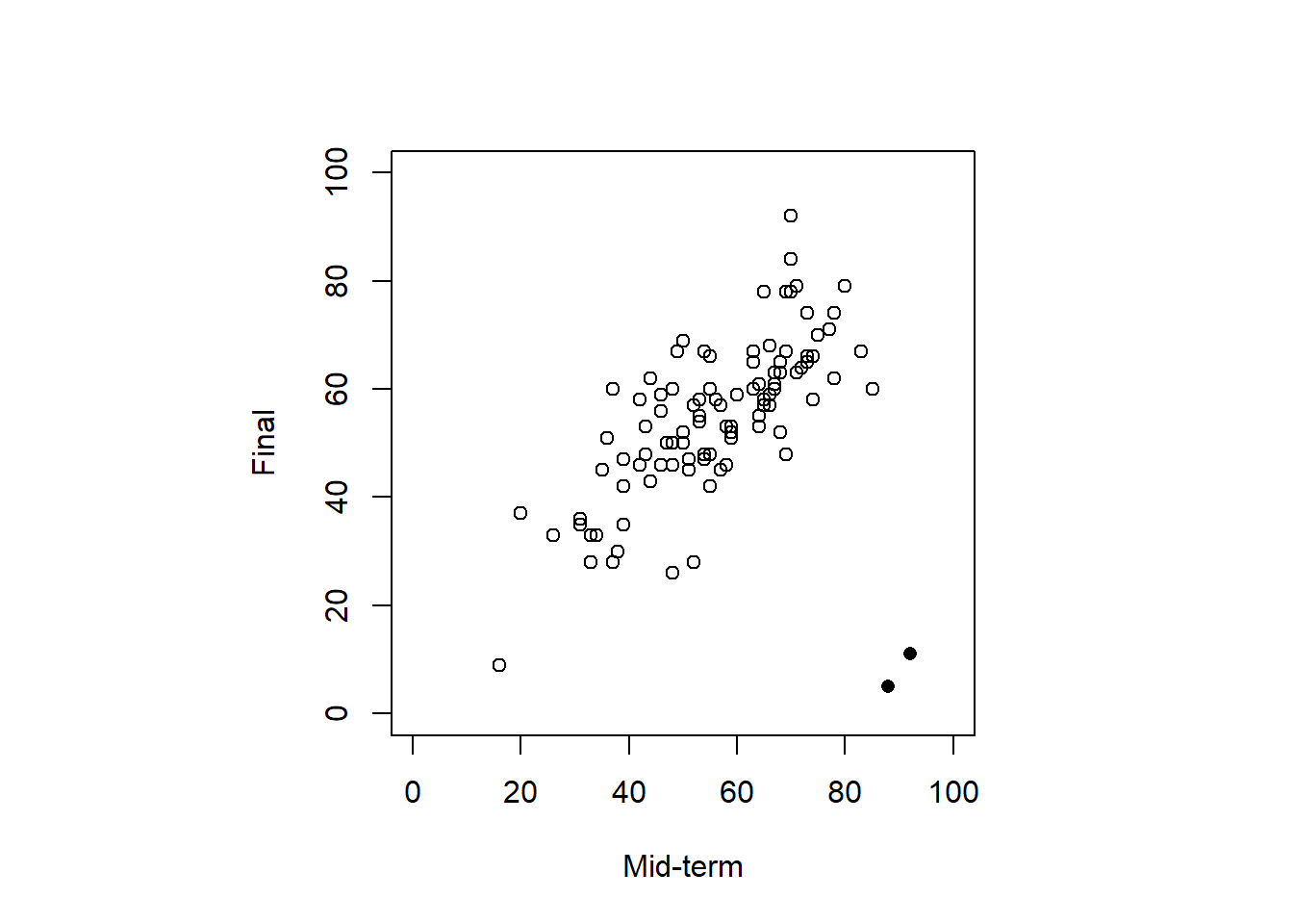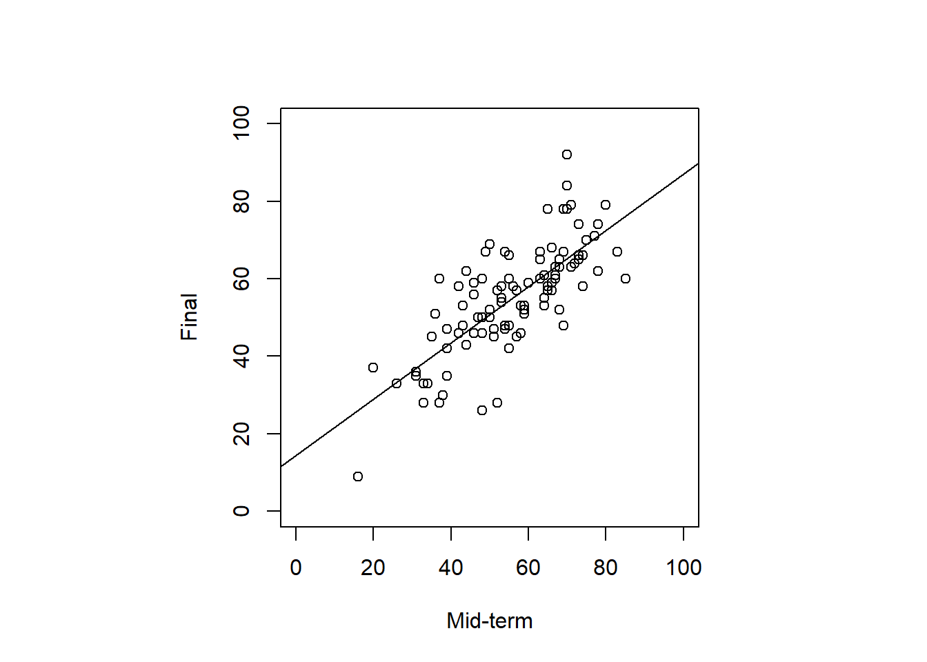 (結果に対し謙虚)平均して、中間試験の得点が1点差の学生を比較した際、中間試験の得点が1点高い学生は、低い学生に比べ、期末試験の得点が0.73点高い。